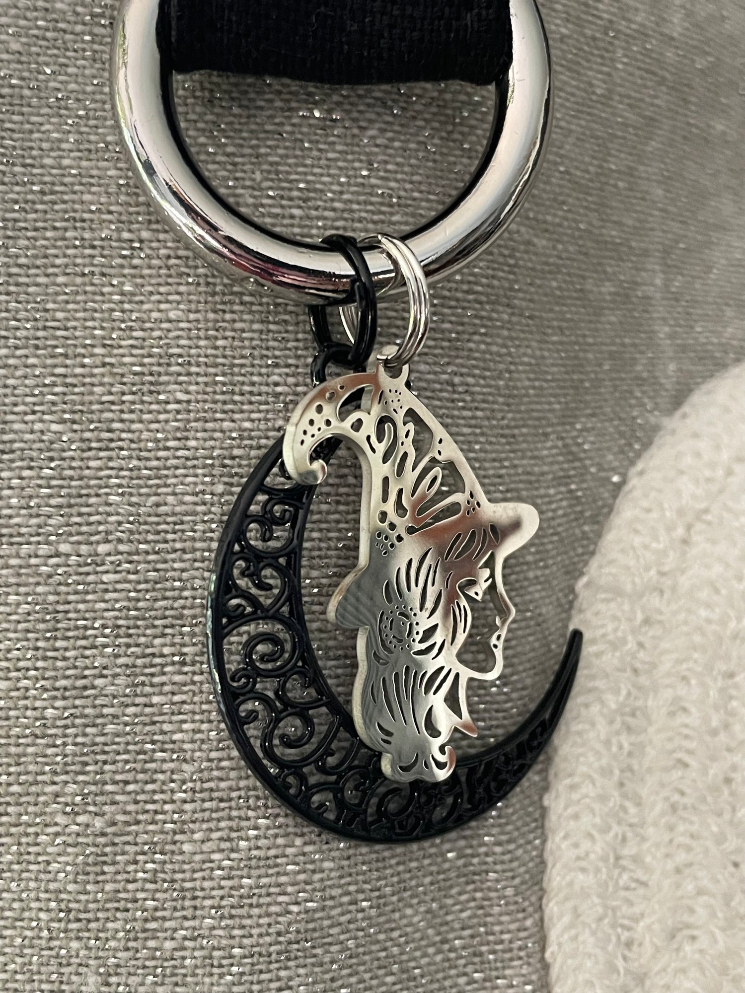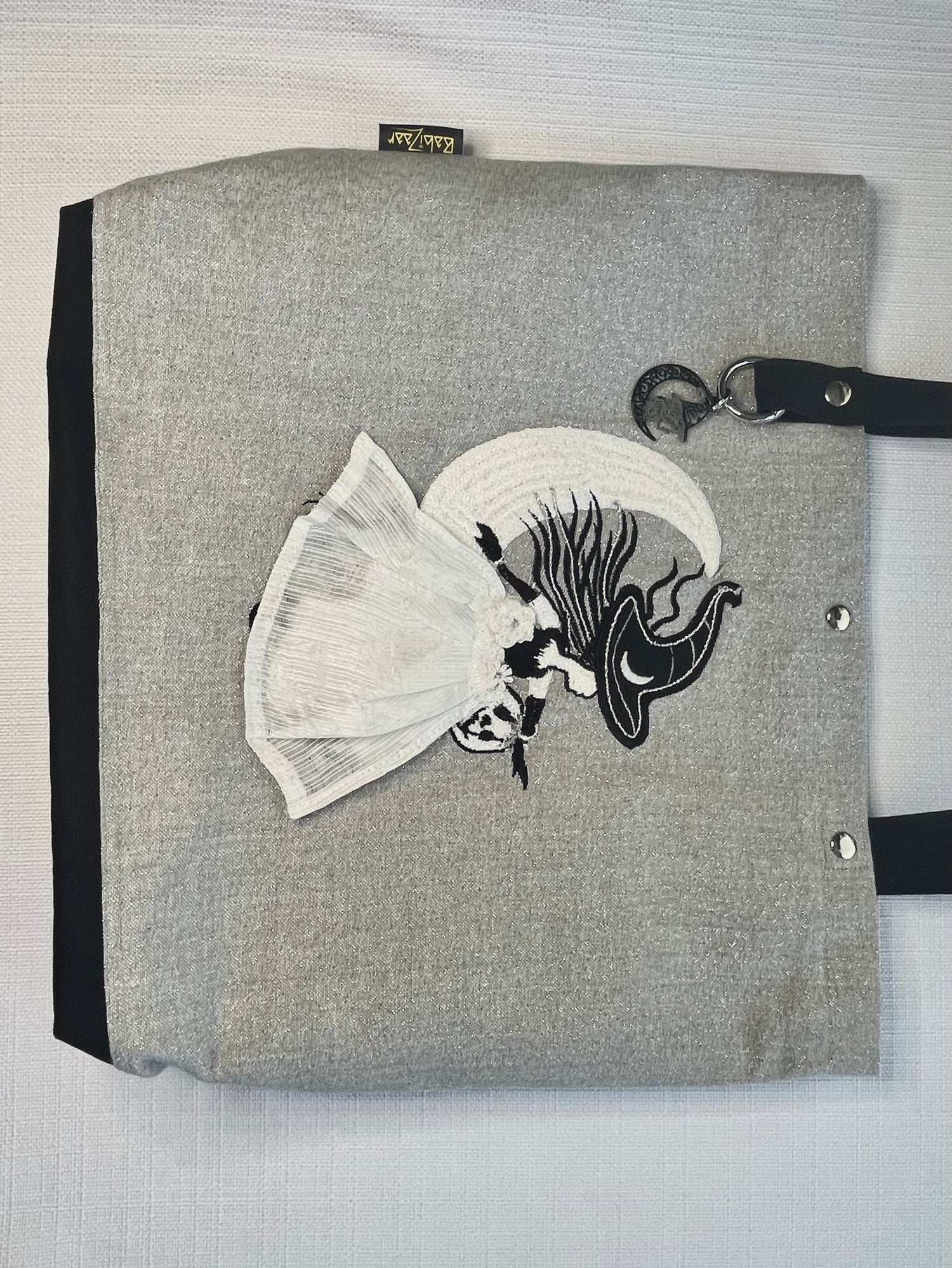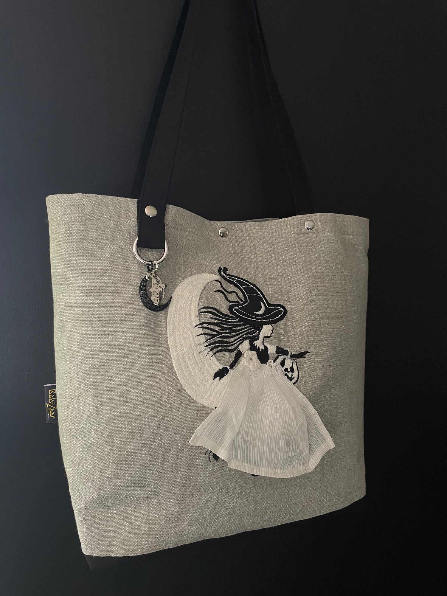Stunning silver linen-blend fabric with a luminous metallic fleck is the backdrop for this gorgeous witchy moon 3D appliqué. Inside is durable and practical, silver water-resistant lining with 3 large contrasting patterned pockets and 4 black linen pockets with star decorative stitching, that are fabulous + functional! Crisp silver fixtures and witchy charms, or you can charm it up with your own unique style.